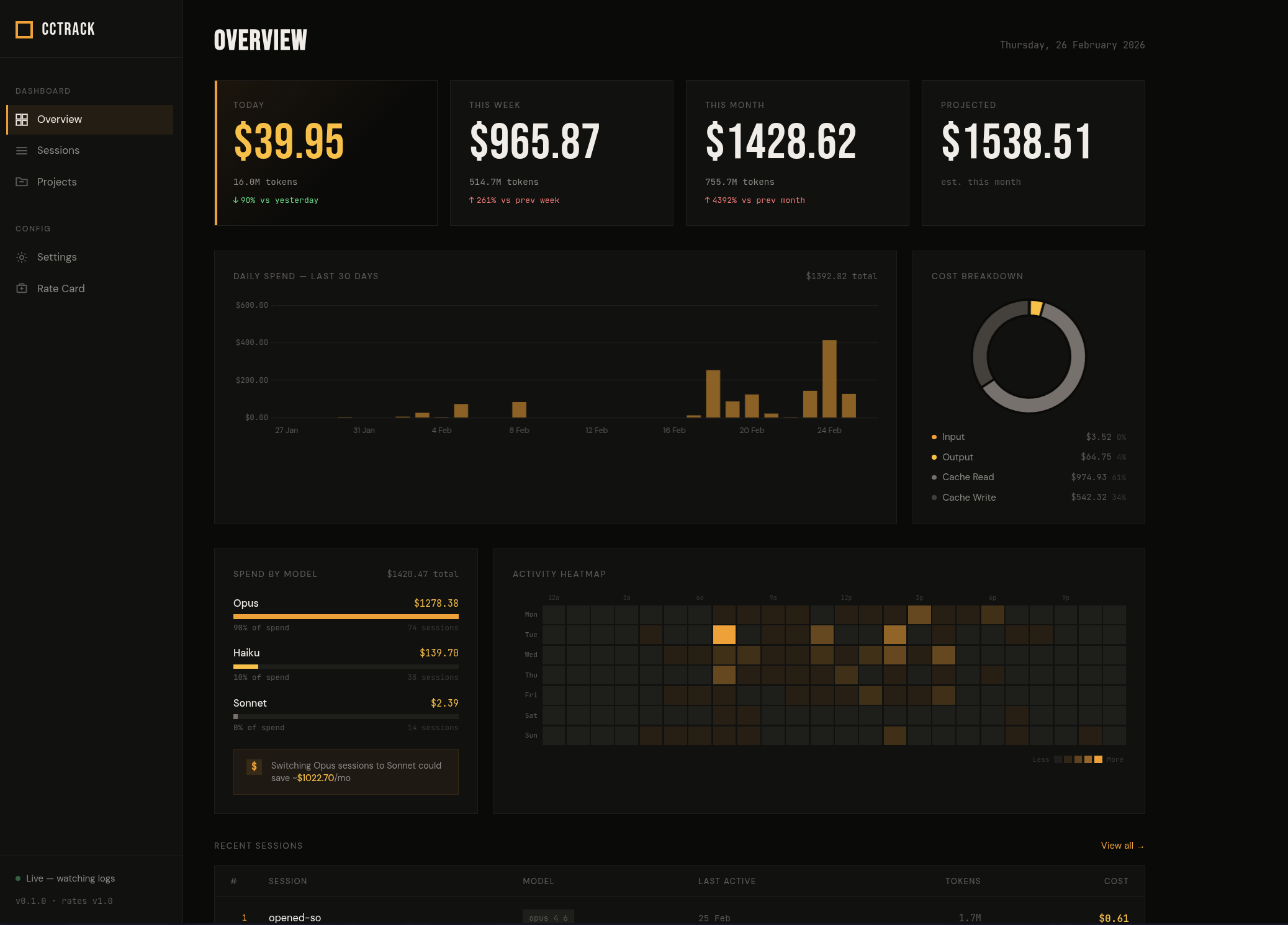 The model split gave me the most pause. Opus accounts for 90% of spend - $1,278.38 across 74 sessions. Haiku is $139.78 across 36 sessions, Sonnet just $2.39 across 24 sessions. cctrack's savings calculator is fairly blunt about the implication: switching my Opus sessions to Sonnet could save approximately $1,022.70 per month at API rates. I've been defaulting to Opus without much thought for most sessions, and while it genuinely is better for the complex architectural work I do, seeing that figure made me think more carefully about which sessions actually need it versus which ones I'm running on Opus out of habit. I've written about Claude Code model selection and pricing before, and this data gave me a much more grounded view on those tradeoffs than anything I had previously.