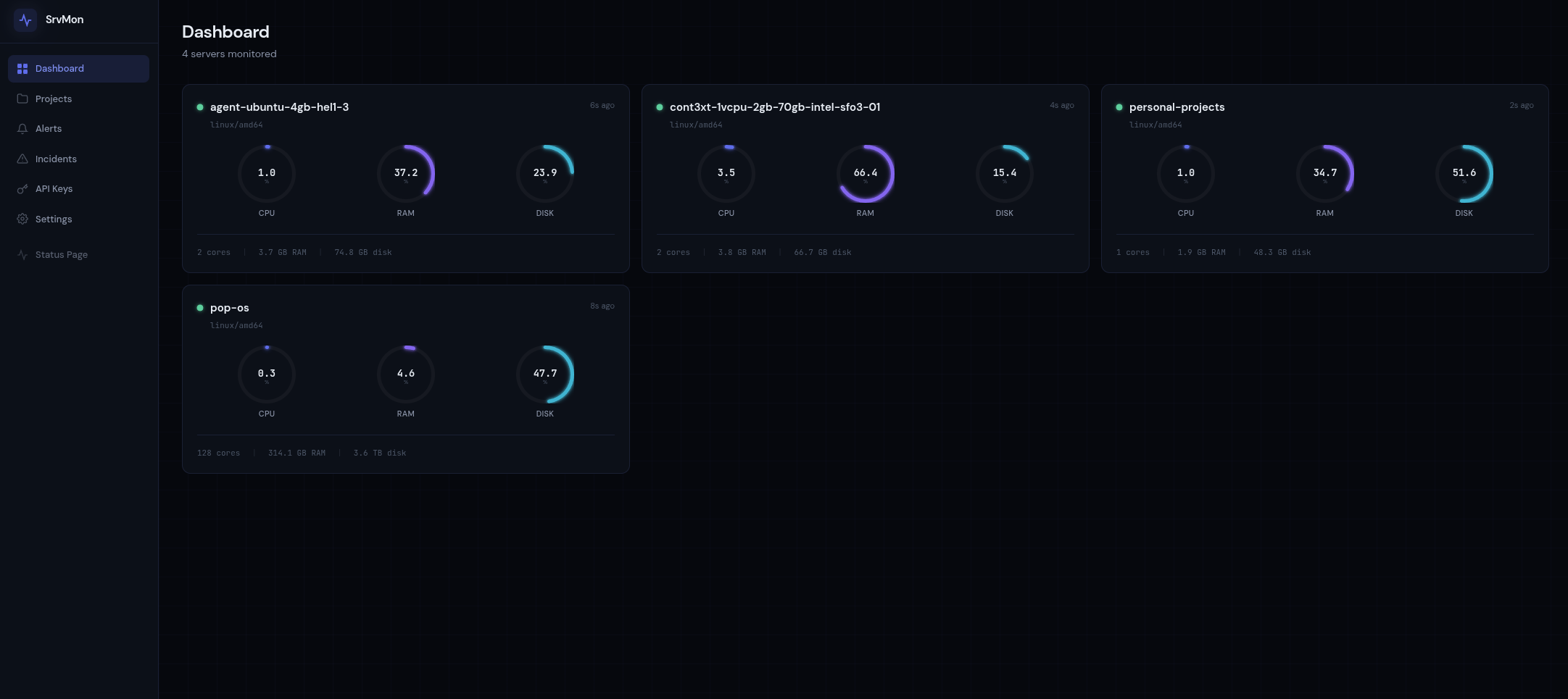 The result is SrvMon - a self-hosted server monitoring platform with a 6MB static agent binary, a Go API server backed by PostgreSQL, and a Vue 3 dashboard. No per-host pricing, no external service dependencies, no complex stack to maintain. It's open source and free to deploy yourself, or you can sign up at srvmon.dev and use the hosted version.